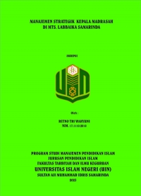 XMLRetno Tri Wahyuni, 2023. “Manajemen Strategik Kepala Madrasah di Mts. Labbaika Samarinda”. Skripsi, Program Studi Manajemen Pendidikan Islam, Jurusan Pendidikan Islam, Fakultas Tarbiyah dan Ilmu Keguruan, Universitas Islam Negeri Sultan Aji Muhammad Idris (UINSI) Samarinda. Penelitian ini dibimbing oleh Dr. Zamroni, M.Pd sebagai pembimbing I dan Amalia Nur Aini, M.Pd sebagai pembimbing II.