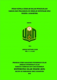 Akhmad Miftakul Ulum, 1711102027. “Peran Kepala Sekolah Dalam Pengelolaan Sarana Dan Prasarana Di SMAN 8 Samarinda”. Skripsi, Program Studi Manajemen Pendidikan Islam, Jurusan Pendidikan Islam, Fakultas Tarbiyah dan Ilmu Keguruan Universitas Islam Negeri Sultan Aji Muhammad Idris Samarinda. Penulisan skripsi ini di bawah bimbingan Bapak Dr. Zamroni, M.Pd selaku pembimbing I dan Ibu Imroh Atul Musfiroh, M.Pd.I selaku pembimbing II.