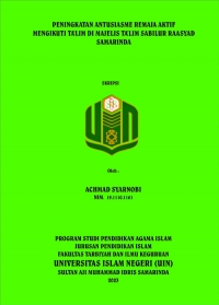 Latar belakang penelitian ini adalah zaman sekarang pergaulan di kalangan remaja yang semakin luas dan cenderung bebas. Sehingga tidak jarang remaja yang kemudian terperosok ke dalam pergaulan yang buruk. Majelis Ta’lim Sabilur raasyad memiliki jamaah yang cukup banyak yang hadir pengajian rutinan di setiap minggunya, dan banyaknya remaja yang terlibat, baik menjadi pendengar sampai yang ikut dalam membantu kegiatan di Majelis Ta’lim Sabilur Raasyad. Adapun tujuan dari penelitian ini yaitu untuk mengetahui cara peningkatan antusiasme remaja aktif mengikuti ta’lim di Majelis Ta’lim Sabilur Raasyad Samarinda.