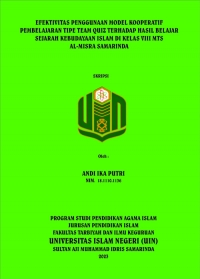 Andi Ika Putri, 2023, “Efektivitas Penggunaan Model Kooperatif Pembelajaran Tipe Team Quiz Terhadap Hasil Belajar Sejarah Kebudayaan Islam di Kelas VIII MTs Al-Misra Samarinda”. Skripsi program studi Pendidikan Agama Islam, Jurusan Pendidikan Islam, Fakultas Tarbiyah dan Ilmu Keguruan Universitas Islam Negeri Sultan Aji Muhammad Idris Samarinda. Penelitian ini dibimbing oleh Dr. Lina Revilla Malik, M.Si selaku pembimbing I dan Sunanik, M.Pd.I selaku pembimbing II.