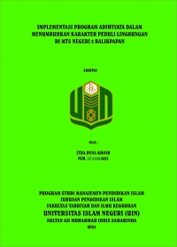 XMLItba Dyna Khoir, 2024, “Implementasi Program Adiwiyata dalam Menubuhkan Karakter Peduli Lingkungan di MTs Negeri 2 Balikpapan”, 2024. Skripsi, Program Studi Manajemen Pendidikan Islam (MPI) Jurusan Pendidikan Islam Fakultas Tarbiyah Dan Ilmu Keguruan, Universitas Islam Negeri (UIN) Sultan Aji Muhammad Idris Samarinda. Penelitian ini dibawah bimbingan Bapak Prof. Dr. Zamroni, M.Pd sebagai pembimbing I dan Bapak Misbahul Fuad, M.Pd.I sebagai pembimbing II. Latar belakang penelitian ini adalah untuk mengetahui bagaimana implementasi program Adiwiyata dapat menumbuhkan karakter peduli lingkungan di MTs Negeri 2 Balikpapan. Sedangkan tujuan dari penelitian ini adalah untuk mengetahui implementasi program Adiwiyata yang dilaksanakan di MTs Negeri 2 Balikpapan, serta mengetahui hambatan-hambatan yang terjadi saat melaksanakan kegiatan program Adiwiyata. Penelitian ini menggunakan metode kualitatif dengan objek penelitian di MTs Negeri 2 Balikpapan. Peneliti menggunakan teknik pengumpulan data berupa observasi, wawancara, dan dokumentasi. Adapun teknik analisis data berupa kondensasi data, penyajian data, dan penarikan kesimpulan. Hasil pada penelitian ini yaitu implementasi Program Adiwiyata di MTs Negeri 2 Balikpapan telah berhasil meningkatkan karakter peduli lingkungan di antara siswa dan staf sekolah. Langkah-langkah yang mencakup kebijakan berwawasan lingkungan, kurikulum sekolah berbasis lingkungan, kegiatan partisipatif, dan pengelolaan sarana pendukung ramah lingkungan telah mengubah paradigma sekolah menjadi lebih peduli terhadap lingkungan. Hambatan dalam meningkatkan karakter peduli lingkungan yaitu pelibatan siswa dan masyarakat, termasuk minimnya kesadaran lingkungan dan keterbatasan sumber daya.