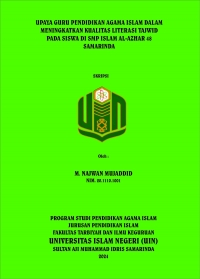 M. Najwan Mujaddid, 2024. Upaya Guru Pendidikan Agama Islam dalam Meningkatkan Kualitas Literasi Tajwid pada Siswa di SMP Islam Al-Azhar 48 Samarinda. Skripsi. Program Studi Pendidikan Agama Islam, Jurusan Pendidikan Islam, Fakultas Tarbiyah dan Ilmu Keguruan, Universitas Islam Negeri (UIN) Sultan Aji Muhammad Idris Samarinda. Penelitian ini dibimbing oleh Bapak Dr. Badrut Tamam, M. Pd. I dan Bapak Ahmad Maulana Syafi’i, M. Si. Latar belakang penelitian ini adalah ditemukannya pada sebagian siswa yang dalam tata cara membaca ayat-ayat Al-Qur’an masih belum sesuai kaidah tajwid yang berlaku, khususnya pada makharijul huruf, idzhar, idgham, ikhfa, dan mad-nya. Penyebab terjadinya permasalahan ini adalah kurangnya kesadaran pada sebagian siswa dalam memahami dan menerapkan ilmu tajwid yang telah diajarkan serta masih minimnya alokasi jam mata pelajaran ilmu tajwid (Pendidikan Al-Qur’an) di kelas. Berdasarkan hal tersebut, upaya-upaya dari guru PAI sangat dibutuhkan dalam menjalankan tugasnya agar kualitas bacaan Al-Qur’an siswa kelas VIII dapat meningkat. Tujuan penelitian ini untuk mengetahui upaya guru Pendidikan Agama Islam dalam meningkatkan kualitas literasi tajwid pada siswa di SMP Islam Al-Azhar 48 Samarinda. Metode yang digunakan pada penelitian ini adalah deskriptif kualitatif. Sumber data pada penelitian ini diperoleh dari sumber data primer dan sekunder. Pengumpulan data penelitian ini menggunakan teknik observasi, wawancara, dan dokumentasi. Informan dalam penelitian ini ialah kepala sekolah, wakil kepala bidang kurikulum, satu guru PAI, satu guru tahsin-tajwid, tiga siswa, dan satu siswi kelas VIII. Adapun pemeriksaan keabsahan data melalui triangulasi sumber dan triangulasi teknik untuk memastikan bahwa data yang diperoleh itu valid, faktual, dan mendalam. Kemudian teknik analisis data dengan tahapan kondensasi data, penyajian data, dan penarikan kesimpulan. Hasil yang didapatkan dari penelitian ini adalah upaya yang dilakukan oleh guru PAI di SMP Islam Al-Azhar 48 Samarinda dalam meningkatkan kualitas literasi tajwid Al-Qur’an siswa diantaranya yaitu, 1) Guru senantiasa memberikan muatan iman dan taqwa (imtaq), yakni membacakan suatu ayat atau hadis serta menyampaikan isi dan kandungannya. Dilanjutkan dengan mengaitkan tujuan pembelajaran Al-Qur’an dengan iptek, 2) Memotivasi siswa dengan cara membaca suatu ayat atau me-murajaah hafalan Al-Qur’an secara kolektif, 3) Penyampaian materi menggunakan metode tutor sebaya dan metode talaqqi dengan nada/irama tilawati, 4) Menerapkan media pembelajaran berbasis teknologi, yakni slide powerpoint dan YouTube untuk penyampaian materi serta memanfaatkan aplikasi quizziz untuk tes pemahaman siswa, dan pembinaan khusus “bengkel Al-Qur’an” bagi siswa yang belum mencapai target, 5) Pemberian tugas membaca (qiraah) dan menulis (imla’) Al-Qur’an secara individu serta menggunakan google form untuk ujian tertulis pada tiap pertengahan dan akhir semester.