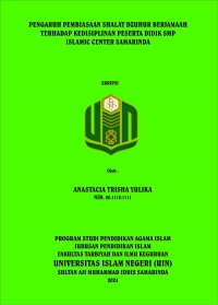 Anastacia Trisha Yulika, 2024. “Pengaruh Pembiasaan Shalat Dzuhur Berjamaah Terhadap Kedisiplinan Peserta Didik SMP Islamic Center Samarinda. Skripsi, Jurusan Pendidikan Agama Islam Fakultas Tarbiyah dan Ilmu Keguruan Universitas Islam Negeri Sultan Aji Muhammad Idris Samarinda”. Penelitian ini dibimbing oleh Drs. M Said Husin, M.A dan Dr. Ahmad Ridani, M.M. Salah satu program yang ada di SMP Islamic Center Samarinda adalah Program Habituasi. Yakni pembiasaan-pembiasaan yang dimulai dari jam masuk hingga jam pulang sekolah. sekolah mengambil kebijakan salah satunya adalah program shalat dzuhur berjamaah di masjid yang berada pada lantai 2. Namun dalam pelaksanaan program tersebut kurang maksimal. Seperti kurangnya kesadaran ketika sudah mendengar adzan berkumandang, berbicara dengan teman dan saling tunggu menunggu ketika pergi berwudhu. Namun secara umum disiplin yang ada di SMP Islamic Center ini sudah berjalan dengan baik dalam disiplin yang lain. Dengan tujuan sebagai sarana latihan untuk menjalankan perintah Allah Swt, kedua dalam rangka meningkatkan kedisiplinan peserta didik dalam menegakkan tiang agama islam. Pelaksanaan disiplin peserta didik pada umumnya berjalan dengan baik walaupun masih ada Tata tertib yang telah dibuat oleh SMP Islamic Center yang kurang dipatuhi. Jenis penelitian adalah deskriptif kuantitatif dengan populasi penelitiannya seluruh peserta didik SMP Islamic Center Samarinda yang berjumlah 156 peserta didik. Penelitian ini menggunakan metode korelasi dengan pengambilan sampel dengan purposive sampling. Metode pengumpulan data yang digunakan dalam penelitian ini adalah observasi, angket dan dokumentasi. Teknik analisis data yang digunakan adalah uji-t untuk mengetahui apakah pembiasaan shalat dzuhur berjamaah berpengaruh signifikan terhadap kedisiplinan peserta didik SMP Islamic Center Samarinda. Berdasarkan hasil perhitungan terdapat pengaruh yang signifikan antara pembiasaan shalat dzuhur berjamaah terhadap kedisiplinan peserta didik. Hal tersebut ditunjukkan pada hasil uji regresi linear sederhana yaitu diperoleh nilai a= 16,693 dan nilai koefisien b = 0,715 sehingga diperoleh persamaan regresi linear sederhana yaitu Y= 16,693+0,715X. kemudian diperoleh nilai thitung sebesar 3,742. Pada tingkat signifikansi 5% atau 0,05, diperoleh ttabel 1.701. maka diperoleh hasil yaitu thitung 3,742 > ttabel 1,70. Dapat ditarik kesimpulan bahwa terdapat pengaruh signifikan sebesar 33,3% pada pembiasaan shalat dzuhur berjamaah (variabel X) terhadap kedisiplinan (variabel Y) peserta didik di SMP Islamic Center.