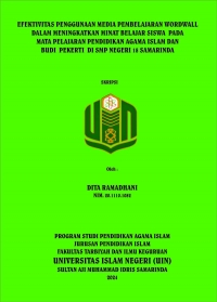 Dita Ramadhani, 2024. “Efektivitas Penggunaan Media Pembelajaran Wordwall dalam Meningkatkan Minat Belajar Siswa pada Mata Pelajaran Pendidikan Agama Islam dan Budi Pekerti di SMP Negeri 18 Samarinda”. Skripsi, Program Studi Pendidikan Agama Islam, Jurusan Pendidikan Islam, Fakultas Tarbiyah dan Ilmu Keguruan, Universitas Islam Negeri Sultan Aji Muhammad Idris Samarinda. Penelitian ini dibimbing oleh bapak Dr. Badrut Tamam, M.Pd. I selaku dosen pembimbing I dan ibu Siti Nasiah, M.Pd selaku dosen pembimbing II. Fenomena rendahnya minat belajar siswa dilatarbelakangi oleh kegiatan belajar mengajar terutama dalam mata Pelajaran Pendidikan Agama Islam dan Budi Pekerti. Hal ini terlihat dari partisipasi siswa yang kurang, dan pemahaman materi yang kurang optimal serta kurangnya pilihan media yang bervariasi. Dengan ini maka peneliti tertarik melakukan uji coba untuk menerapkan media pembelajaran Wordwall, dikarenakan ada keunggulan yang dimiliki yakni dapat meningkatkan proses belajar serta menciptakan suasana belajar yang membuat siswa senang, selain itu media pembelajaran Wordwall juga dapat melatih ketelitian, kecermatan, dan ketepatan serta kecepatan siswa. Tujuannya untuk mengetahui apakah penerapan media pembelajaran Wordwall ini efektif dalam meningkatkan minat belajar pada mata pelajaran Pendidikan Agama Islam dan Budi Pekerti di SMP Negeri 18 Samarinda. Penelitian ini merupakan penelitian kuantitatif dengan bentuk quasi experimental design. Populasi dalam penelitian ini adalah seluruh siswa kelas IX yang berjumlah 131 siswa. Sampel dalam penelitian ini sebanyak 62 siswa, terdiri dari 29 siswa kelas kontrol (IX D) dan 33 siswa kelas eksperimen (I X C). Teknik pengumpulan data yang digunakan dalam penelitian ini yaitu observasi, angket, dan dokumentasi. Adapun teknik analisis data menggunakan uji validitas, uji reliabilitas, dilanjutkan dengan uji prasyarat yaitu uji normalitas, uji homogenitas, uji Independent sample t test dengan menggunakan bantuan program IBM SPSS versi 25. Hasil analisis data diperoleh nilai ????ℎ???????????????????? sebesar 11,264 dan ???????????????????????? sebesar 1,670 maka sebagaimana keputusan uji independent sample t test apabila ????ℎ???????????????????? > ???????????????????????? maka ???????? diterima. Dan untuk mengetahui minat sisw berdasarkan hasil koefisien determinasi dengan hasil interpretasi koefisien korelasi 0,410 dimana nilai tersebut masuk kedalam kategori sedang. Sehingga kesimpulan yang dapat diambil adalah media pembelajaran Wordwall efektif dalam meningkatkan minat belajar pada mata pelajaran Pendidikan Agama Islam dan Budi Pekerti di SMP Negeri 18 Samarinda.