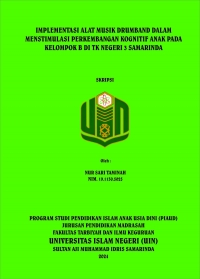 ABSTRAK. Nur Sari Taminah, 2024, “Implementasi Alat Musik Drumband Dalam Menstimulasi Perkembangan Kognitif Anak Pada Kelompok B Di TK Negeri 3 Samarinda”. Skripsi, Program Studi Pendidikan Islam Anak Usia Dini, Jurusan Pendidikan Madrasah, Fakultas Tarbiyah dan Ilmu Keguruan, Universitas Islam Negeri Sultan Aji Muhammad Idris Samarinda. Penelitian ini dibimbing oleh Ibu Nurwati, M.Pd. selaku pembimbing I dan Ibu Amalia Nur Aini, M.Pd. selaku pembimbing II. Latar belakang penelitian ini adalah pendidikan anak usia dini merupakan penyelenggaraan pendidikan untuk mendukung dan membantu perkembangan, pertumbuhan rohani dan jasmani anak usia dini. Musik berperan penting dalam proses pembelajaran anak. Salah satu seni musik yang berfokus pada daya mengingat yaitu seni musik drumband. Maka dari itu pentingnya perkembangan kognitif anak melalui kegiatan drumband. Penelitian ini bertujuan untuk mengetahui implementasi alat musik drumband dalam menstimulasi perkembangan kognitif anak. Jenis penelitian ini menggunakan metode deskriptif kualitatif. Sumber data yang digunakan yaitu sumber data primer yang diperoleh dari informasi guru kelas atau pelatih melalui observasi dan wawancara. Sumber data sekunder diperoleh melalui dokumentasi dan beberapa arsip dari TK Negeri 3 Samarinda. Teknik pengumpulan data yang digunakan yaitu observasi, wawancara dan dokumentasi. Teknik keabsahan data yang digunakan dalam penelitian ini adalah triangulasi sumber, triangulasi teknik dan triangulasi waktu dengan menggunakan model yang digunakan oleh Miles dan Huberman dengan 3 langkah yaitu reduksi data, penyajian data dan penarikan kesimpulan. Hasil analisis data, pada tahap perencanaan merupakan tahapan penting untuk dilakukan agar tujuan yang diharapkan dapat tercapai dengan baik. Perencanaan kegiatan drumband di TK meliputi persiapan alat, pengenalan alat serta strategi dalam melatih. Tahap pelaksanaan, di tahap ini guru atau pelatih melaksanakan kegiatan alat musik drumband yang berguna untuk menstimulasi perkembangan anak yang mencakup pengenalan angka yang mana anak mampu mengenal angka 1 sampai 7, mengacak angka yaitu anak mampu mengacak angka sesuai dengan ketukan yang ada di dalam notasi pada lagu dan pengenalan bentuk dan ukuran benda adalah anak mampu mengenal bentuk persegi panjang dan lingkaran serta ukuran besar dan kecilnya benda pada alat drumband. Evaluasi berkala dilakukan sebagai mengukur kemajuan anak dalam memainkan alat musik drumband untuk menstimulasi perkembangan kognitif nya.