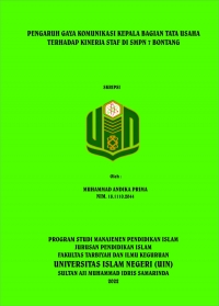 XMLMuhammad Andika PRIMA. 2022. “Pengaruh Gaya Komunikasi Kepala Bagian Tata Usaha Terhadap Kinerja Staf Di SMPN 7 Bontang ”. Program Studi Manajemen Pendidikan Islam. Fakultas Tarbiyah dan Ilmu Keguruan Universitas Islam Negeri Sultan Aji Muhammad Idris (UINSI) Samarinda. Penulisan skripsi ini dibawah bimbingan Muhammad Iwan Abdi, M.Si selaku Pembimbing I, dan Nurwati M.Pd selaku Pembimbing II.