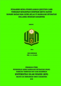 Umi Rohimah, 2022. “Pengaruh Media Pembelajaran Question Card Terhadap Kemampuan Berpikir Kritis Siswa Pada Materi Bangun Datar Kelas IV Madrasah Ibtidaiyah Sullamul Hidayah Samarinda”. Skripsi, Program Studi Pendidikan Guru Madrasah Ibtidaiyah, Jurusan Pendidikan Madrasah, Fakultas Tarbiyah dan Ilmu Keguruan, Universitas Islam Negeri Sultan Aji Muhammad Idris Samarinda. Penelitian ini dibimbing oleh Marniati Kadir, M.Pd selaku pembimbing I dan Sunanik, M.Pd.I selaku pembimbing II.