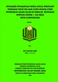 Eva Mayang Sari, (1711101119). “Pengaruh Penggunaan Media Sosial Whatsapp terhadap Minat Belajar Siswa Bidang Studi Pendidikan Agama Islam di Sekolah Menengah Pertama Negeri 4 Loa Kulu Kutai Kartanegara”. Skripsi, Prodi Pendidikan Agama Islam, Jurusan Pendidikan Islam, Fakultas Tarbiyah dan Ilmu Keguruan. Universitas Islam Negeri Sultan Aji Muhammad Idris Samarinda. Penelitian ini dibimbing oleh Bapak Rusdi, S.Ag., M.SI selaku dosen pembimbing I dan ibu Dr. Siti Nor Asiah, S.E., M.Pd selaku Dosen Pembimbing II.