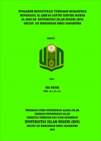 XMLTri Putri, 1811101141. “Pengaruh Konsentrasi Terhadap Kemampuan Menghafal Al-Qur’an Santri Tahfidz Ma’had Al-Jami’ah Universitas Islam Negeri (UIN) Sultan Aji Muhammad Idris Samarinda. Skripsi, Program Studi Pendidikan Agama Islam Fakultas Tarbiyah dan Ilmu Keguruan Universitas Islam Negeri (UIN) Sultan Aji Muhammad Idris Samarinda”. Penelitian skripsi ini dibawah bimbingan ibu Wahdatun Nisa, MA selaku Pembimbing I dan Bapak Abdul Razak, M.Pd selaku Pembimbing II.
