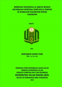 Mohammad Zainul Fajri, 2022. “Hubungan Menghafal Al-Qur’an dengan Kecerdasan Spiritual Siswa Kelas Tahfidz di Madrasah Tsanawiyah Negeri Samarinda”. Skripsi Jurusan Pendidikan Islam Negeri Sultan Aji Muhammad Idris (UINSI) Samarinda. Penelitian ini dibimbing oleh Bapak Prof. Dr. Muhammad Nasir, M.Ag. selaku dosen pembimbing I dan Bapak H. Marajo, Lc., M.Pd.I selaku dosen pembimbing II.