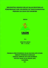 Indah Tri Cahyani, 1711305026, 2021. “Implementasi Kegiatan Kolase Dalam Menstimulus Perkembangan Anak kelompok B di Tk Purnama Loa Janan Samarinda”. Skripsi Program Studi Pendidikan Anak Usia Dini, Jurusan Pendidikan Madrasah, Fakultas Tarbiyah dan Ilmu Keguruan, Institut Agama Islam Negri (IAIN) Samarinda. Penelitian ini dibimbing oleh Drs. H. Ahmad Riyadi SS. M. Hum dan Nurwati, M.Pd.