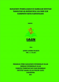 XMLLuthfi Condro Waskito, 2021. ”Manajemen Pembelajaran di Madrasah Diniyyah Takmiliyah Ad-Da’wah Loa Duri Ilir Kabupaten Kutai Kartanegara”. Skripsi, Prodi Manajemen Pendidikan Islam Jurusan Pendidikan Islam Fakultas Tarbiyah dan Ilmu Keguruan Institut Agama Islam Negeri (IAIN) Samarinda. Penelitian ini dibimbing oleh Bapak Dr. Zamroni, M.Pd selaku pembimbing I dan Ibu Imroh Atul Musfiroh, M.Pd.I selaku pembimbing II.