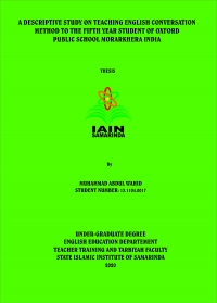 XMLMuhammad Abdul Wahid, 2019. “A Descriptive of Teaching English Speaking to The Fifth Year Student of Oxford Public School Morarkhera India” Undergraduate Degree. Thesis, Education and Teacher Training Faculty, State Institute of Islamic Studies Samarinda. Advisors: Bahrani, M.Pd as the first advisor and Dr. Umar Fauzan, M.Pd as the second advisor. Speaking is one of language skill which is very important to be mastered by students in order to be good communicator. Speaking is the verbal use of language to communicate with others. Speech is about making choices. Students must choose how to interact in expressing themselves and forming social relationship through speech According to Hall, speaking in an ability that is taken for granted, learned as it is through process of socialization through communicating. Speaking is making use of language in ordinary voice; uttering words; knowing and being able to use a language; expressing oneself in words; making speech. The objective of this research is to know the students’ quality in speaking skill based on mastery level of speaking. The research design is descriptive. The subjects of study is fifth year student of Oxford Public School who meet the researcher’s criteria. Data collection technique in this research are, interview, observation and documentation. The data is analyzed using the model of Miles Huberman. After being collected, the data is verified using three activities by method and another researcher. The result of this researcher shows that students at fifth year of Oxford Public School located in inferential level of mastery speaking skill which means their quality in speaking can be categorized as good.